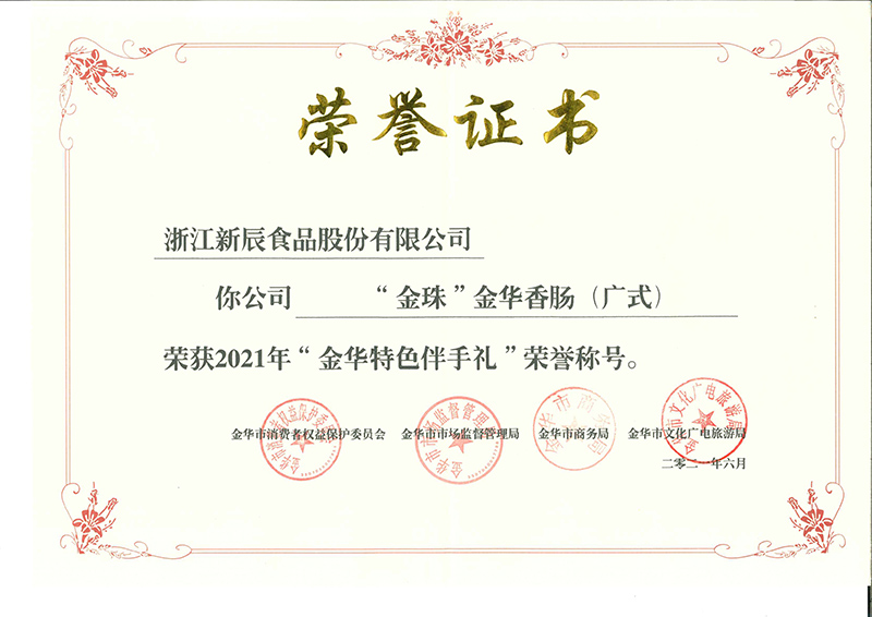 “金珠”金華香腸(廣式)榮獲2021年“金華特色伴手禮”榮譽(yù)稱號(hào)。